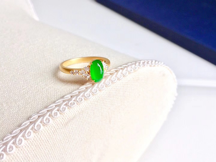 佩戴方式:戒指 珠宝材质:翡翠玻璃种满绿戒面、钻石VS级、18K金 珠宝整体尺寸:13号(可改号)